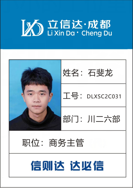 姓名:石斐龍 工號(hào):DLXSC2C031 部門:川二六部 職位:商務(wù)主管