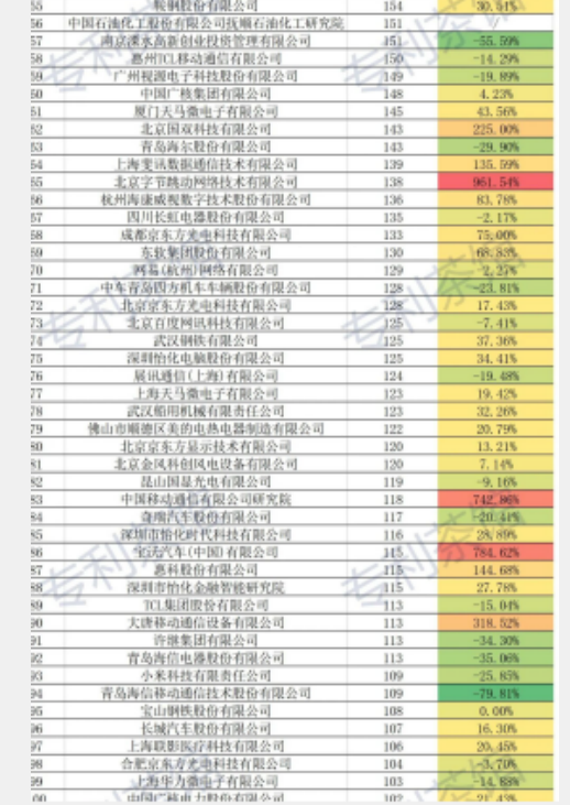 數(shù)據(jù)說明:數(shù)據(jù)來源incoPat,會(huì)因?yàn)閿?shù)據(jù)公開周期、企業(yè)數(shù)據(jù)未做申請(qǐng)人標(biāo)準(zhǔn)化處理等因素造成一定誤差。數(shù)據(jù)為國內(nèi)企業(yè)2020年上半年(20201月-6月)的發(fā)明授權(quán)量數(shù)據(jù),排名取授權(quán)量前100企業(yè),較去年同期的增速數(shù)據(jù)比對(duì)對(duì)象為企業(yè)在2019年1月-6月的授權(quán)量,“/”表示2019年上半年數(shù)據(jù)為0,數(shù)據(jù)公開截止及檢索日2020年7月5日,數(shù)據(jù)為不完全統(tǒng)計(jì),未考慮特殊情況,與任何指標(biāo)無關(guān),以官方公開數(shù)據(jù)為準(zhǔn)僅供參考!