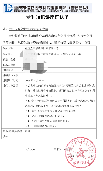 2019年3月5日重慶信立達(dá)在《中國(guó)人民解放軍陸軍軍醫(yī)大學(xué)》順利召開(kāi)專利講座