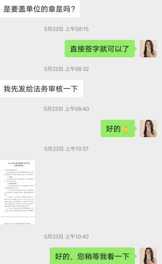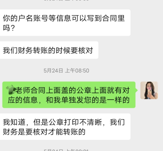 19號(hào)一早客戶確定了相關(guān)項(xiàng)目,客戶也很爽快。然后就有一些疑問(wèn):是否會(huì)保密,價(jià)格等相關(guān)問(wèn)題,給客戶一一解決疑慮之后客戶基本了解了,也構(gòu)建了初步的信任,只是合同擬定過(guò)去之后,需要他們單位法務(wù)審核,單位審核說(shuō)需要簡(jiǎn)單修改,法務(wù)那邊過(guò)不了,財(cái)務(wù)審核不過(guò)不讓打款,于是就在雙方法務(wù)都認(rèn)可的情況下小小的改動(dòng)了一下。發(fā)過(guò)去之后又有一個(gè)新問(wèn)題:公章不清晰,公章信息這些看不清楚等,需要我們把公戶信息加在合同里面。