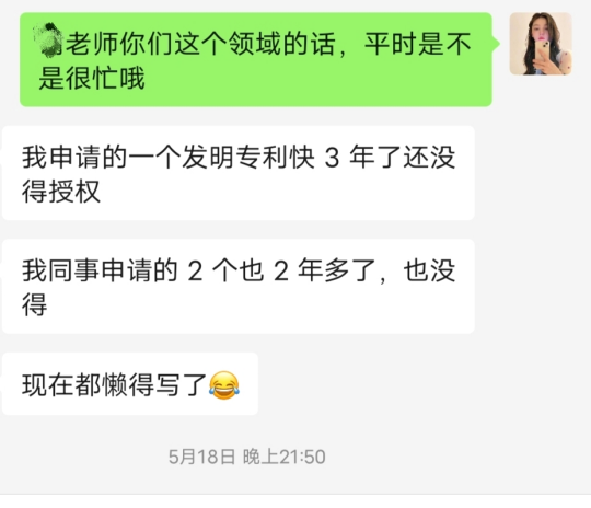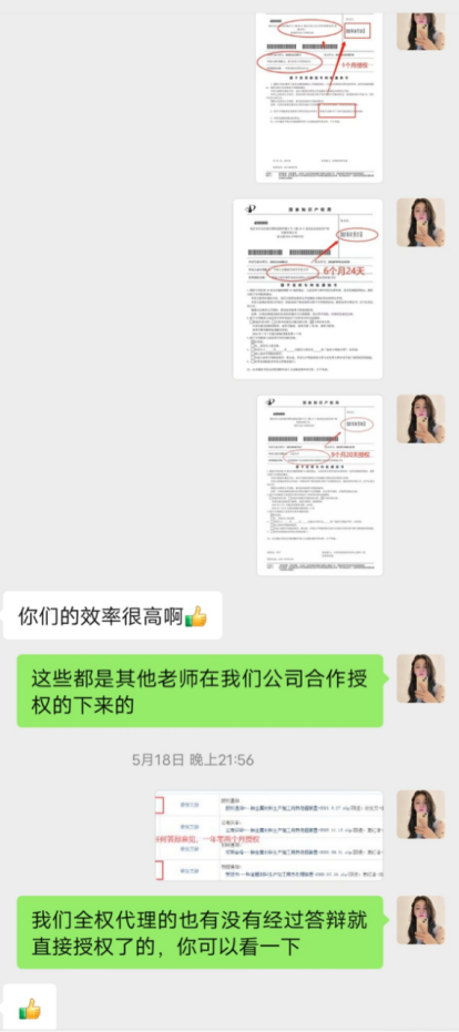 客戶是我在5.5號(hào)通過(guò)撥打電話,打出來(lái)的,最開(kāi)始客戶說(shuō)自己暫時(shí)不需要,后期可能需要,也愿意先加微信,加上之后就是簡(jiǎn)單的互相問(wèn)好,自我介紹,公司的介紹,然后就沒(méi)有其他的過(guò)多的交流了。中途也有給客戶發(fā)我們公司的授權(quán)證書(shū),但是客戶從來(lái)都是只讀不回,直到5.18號(hào)晚上,給客戶發(fā)了發(fā)明專(zhuān)利預(yù)審6個(gè)月左右下發(fā)結(jié)果的相關(guān)信息。