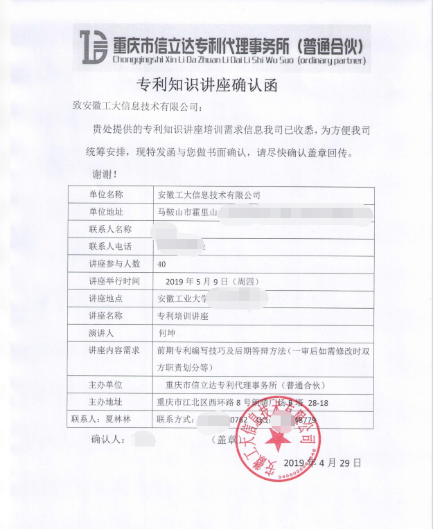 2019年5月9日重慶信立達(dá)在《安徽工大信息技術(shù)有限公司》順利召開專利講座