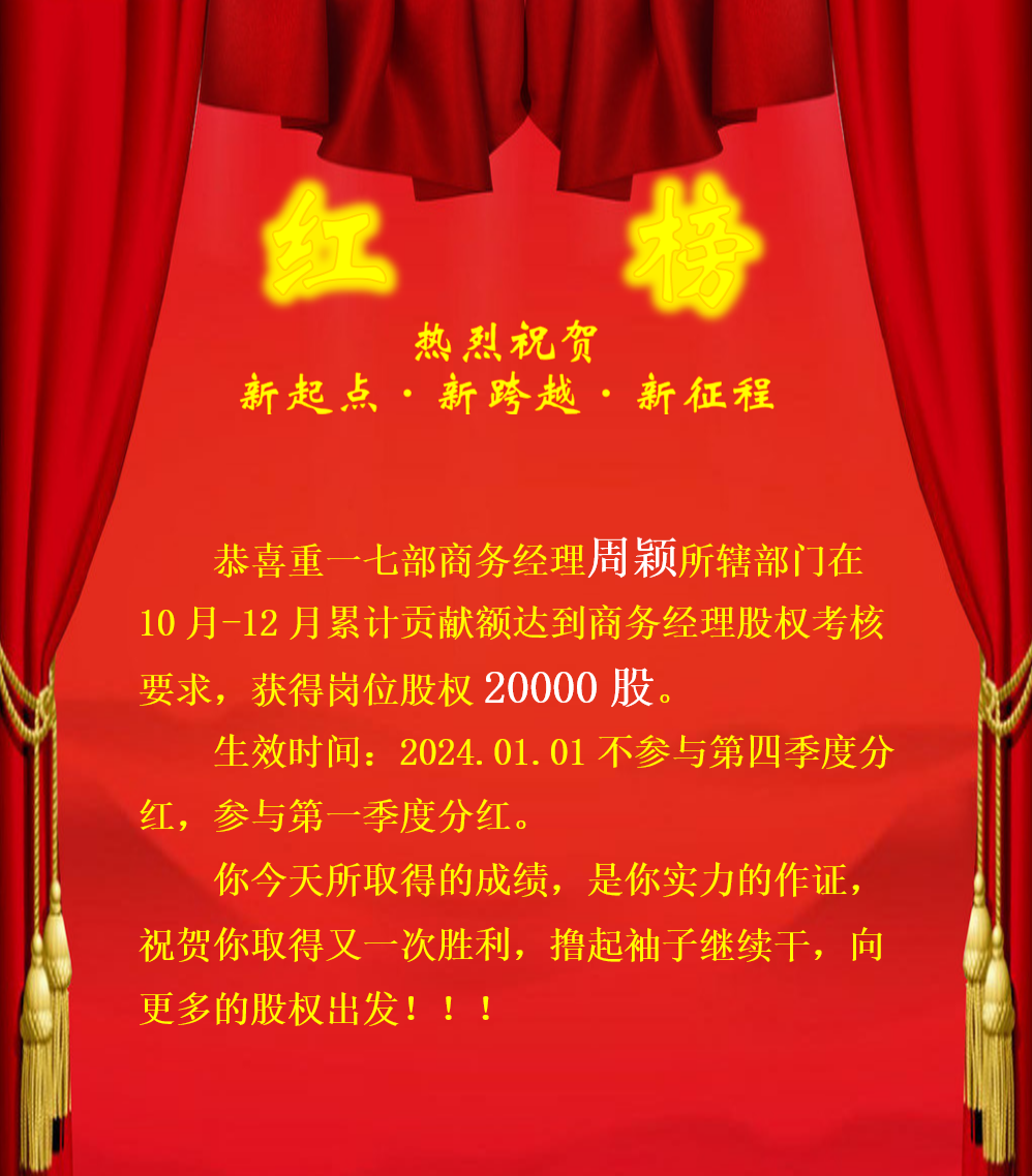 重一七部周經(jīng)理10月-12月成功獲得經(jīng)理崗位股份,在職業(yè)生涯中,晉升和獲得公司股份是一個(gè)重要的里程碑。 這不僅是對(duì)個(gè)人能力和貢獻(xiàn)的認(rèn)可,還能帶來(lái)一系列積極的影響。