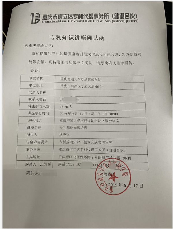 2019年9月17日重慶信立達(dá)在《重慶交通大學(xué)交通運輸學(xué)院》 順利召開專利講座